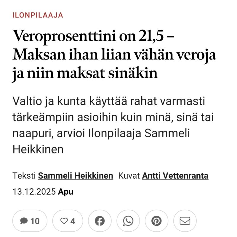31.7.2025 Iltalehti: Kansanedustaja: Loppuvuoden suomalaiset työskentelevät valtiolle