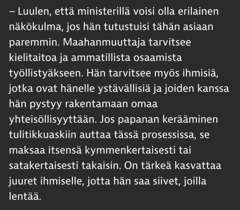 Että kotouttaminen muka vaatii, että sosiaalitäti vie maahanmuuttajat keräilemään metsistä eläinten papanoita? Eijjjumalauta🤦♂️